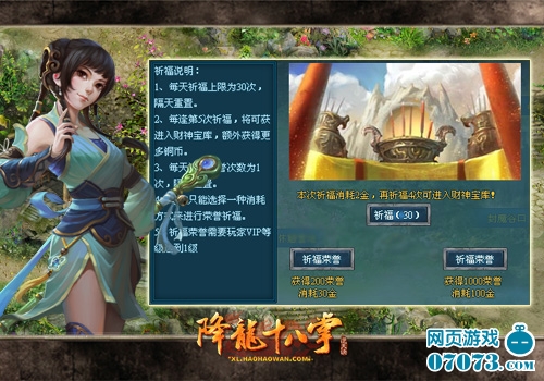 3、祈福宝箱:在这里各位大侠可以用金币来祈福荣誉,这里分别有两种祈福的方式,一种是用30金币祈福获得200荣誉,另一种是用100金币祈福获得1000荣誉。