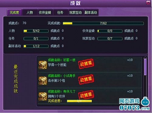 1、点击游戏的右上角的『成就』按钮(或者按H键)即可打开成就系统界面。点击『完成度』选项可以看到自己总共获得的成就点数,每个模块的成就完成度,以及近期获得的成就。