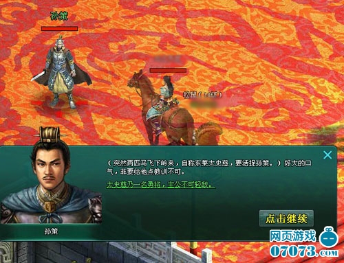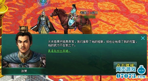 汉室不兴,皇权丧失。董卓专权,滥杀君臣百姓,致使天下大乱,群雄并起。江东孙策雄才大略引来四方豪杰相助,某日一将自称东莱太史慈,要活捉孙策,口气狂傲,帐下大将纷纷请命要给那狂妄之徒一个教训。孙策听闻东莱太史慈乃一猛将,欲将他招之帐下,不过在此之前还要先挫他锐气。