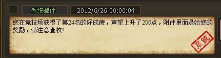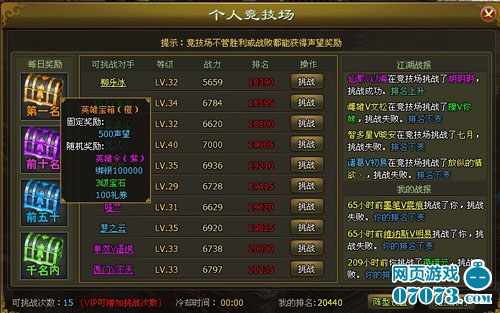 如果你能在群雄纷争中取得一个好名次,系统也不会吝啬。系统每日为排名前列的玩家送上奖品:第一名将能得到500声望的固定奖励和包括紫色英雄令在内的珍贵随机物品。在此,还要提醒各位新入武林的新秀们,可不要怕在竞技场中连败丢人而放弃这样一个机会,因为不管输赢,都会有声望奖励,同时这也是增进自身实战经验的好机会。