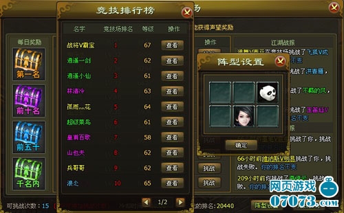 竞技场是《倚天》中一个合法的解决争端的途径,受到所有武林人士的欢迎。玩家每日可挑战15次,VIP玩家次数有所增多,但不会有大影响。每次该界面将会显示排名在自身之前的10位英雄供其挑战,当然如果你是天下第一,能挑战的也就是前11名了。挑战胜利,你就会顶替他的位子,不过如果不注意自身实力好高骛远的话,就没办法前进,说不定还要被其他人打败掉下名次。