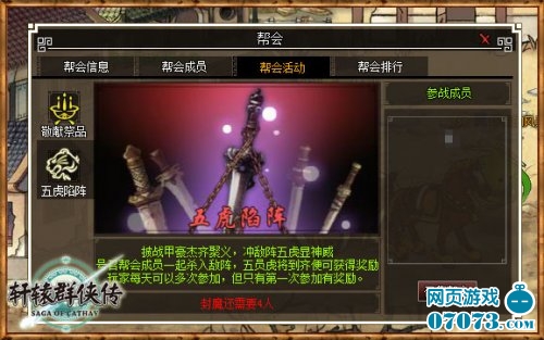 帮会活动共分为两种,分别为“敬献祭品”和“五虎陷阵”。侠士每天可以为帮派敬献一次祭品,消耗一定的银币或者元宝获得一定的声望,最多可以获得1000点哦~而“五虎陷阵”则是召集帮会中的其他成员,一起杀入敌阵,获得海量声望!两个活动声望多多,玩家每天可不要错过哦!