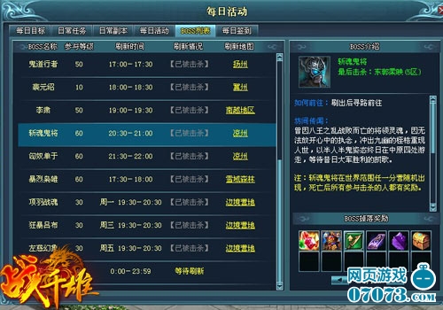 国战页游《战千雄》中的斩魂鬼将乃是西汉时期,在八王之乱中丧生的将领灵魂集合体,极大的怨念使其拥有超乎常人的战斗力,彰显了汉初名将的尚武之风。游戏中,斩魂鬼将将在每天20:30至21:00,随机出现在世界范围的任一角落。所有等级在60级以上的玩家,均可利用神行符快速进入战场,向其发起挑战,感受与西汉名将对阵沙场的畅快体验。