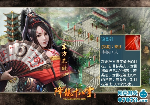 《降龙十八掌》中的追影针,其技能描述是:攻击敌方速度最快的目标。若目标是人,则对目标造成58%的伤害;若目标是仙,则造成80%的伤害;若是妖,则造成100%的伤害。