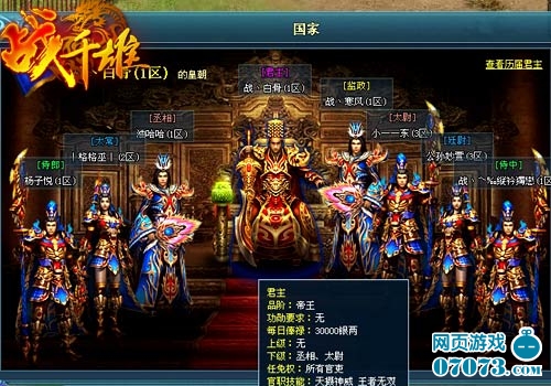 在《战千雄》中,国家最高领导者为君主,特色黄袍加身,并拥有“天摄神威”、“王者无双”两大专属技能,并可以任免任何官职。但同时,官职的任免也要根据玩家自身的功勋是否能担任国家重要官职。君主是由玩家担任,在《战千雄》的世界里,你可以领会一统天下的感觉,天下万民一呼百应。当然,玩家也需要有足够的实力让子民臣服。