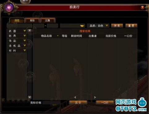 在拍卖行中为大家准备了浏览功能,通过浏览玩家可以选择所需道具类型,如武器、防具、饰品、消耗品、材料等。