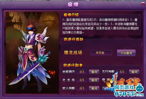 打开雇佣系统的副本界面,在扣除一定的钱币后,选择你想要快捷完成的游戏副本,在活动开启时,佣兵就会为你去屠龙斩将;当活动结束后,你就能够领取经验和威望。如此简单快捷,是在你分身乏术之时的最佳选择!