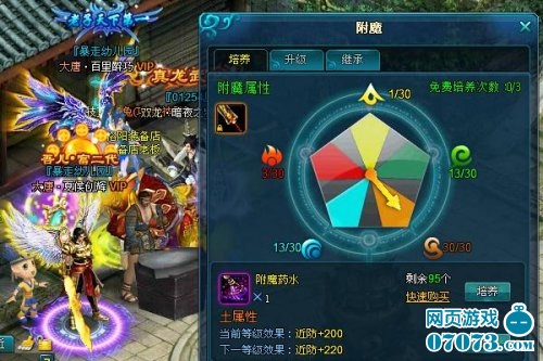 ¡¡¡¡Òª½«ÕâÎåÖÖÊôÐÔ¿ªÆô£¬¾ÍÒªµ½ÂåÑôµÄ×°±¸Àϰ崦½øÐГÅàÑø”²Ù×÷¡£Í¨¹ý½çÃæ¿ÉÒÔ¿´µ½£¬Ã¿ÖÖÊôÐÔµÄÅàÑøÖµÉÏÏÞÊÇ30µã£¬µã»÷“ÅàÑø”Ö¸Õë¾Í»áת¶¯£¬µ±Í£ÁôÔÚÏàÓ¦µÄÊôÐÔÇøÓòʱ£¬¸ÃÊôÐÔ»ñµÃ1µãÅàÑøÖµ¡£µ±¸ÃÊôÐÔÅàÑøµ½30µãʱ£¬Ôò¿Éµã»÷“¸½Ä§”¿ªÆô¸ÃÊôÐÔ£¬´ËʱÎäÆ÷ÊôÐԵ珽ħÊôÐÔ”À¸ÖиÃÊôÐÔ±äΪÂÌÉ«²¢ÌṩÏàÓ¦µÄÊôÐԼӳɡ£