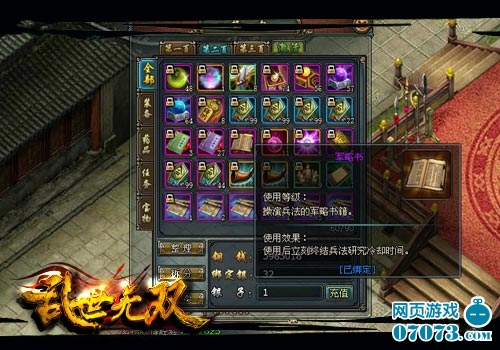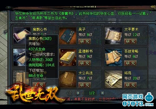 不过,经过改版后的《乱世无双》研究兵法将消耗韬略,虽然不多,但玩家可以选择做几个环任务之后,在进行研究。同时,每天中午12点到1点一个小时的双倍读书时间千万不要错过。此外,小编还推荐各位去泰山刷“军略书”,每次至少能有一本,所以几遍泰山下来,各位就能够轻松升级兵法。