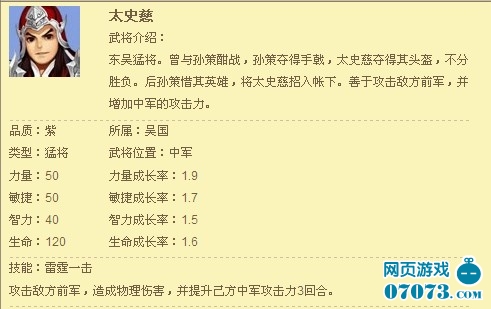 虽然说是前期,但是也是50级之后的阶段了。37wan《龙将》游戏初期升级很快,50级两天就到了,所以50级之前的紫色将领并不适宜招募,当然,绝对猛将的单秒流还是需要太史慈的,V6的紫魂上来就够的,可以在30级就招上。