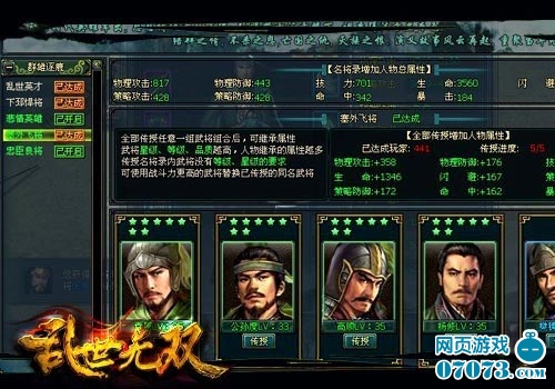 招降到相应武将、并将武将实力提升至一定程度时,玩家就能够点开名将录进行“传授”过程了。《乱世无双》中每一个名将录章节都有相应的武将,玩家只有将特定武将逐一进行传授,且武将实力越强,那么“达成章节”之后属性将会有大幅度的飙升!此外,名将录也是游戏中“资源回收再利用”的绝佳方式,玩家在遇到更高级、更优资质武将时,无需丢弃原先苦练的武将,只需将他们传授入名将录,即可拥有“得属性、不浪费”双重体验,让你不再犹豫“武将丢弃与否”的问题,甚至在低等级时升阶低级武将也不会觉得可惜!