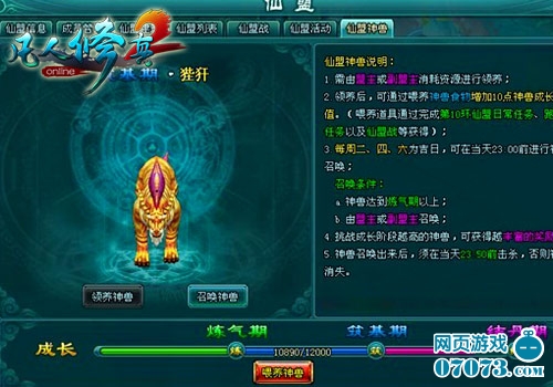 游戏中神兽的成长期分为3个阶段:分别是练气期、筑基期、结丹期。玩家可以使用神兽食物喂养神兽来增加成长值,每个神兽食物可增加10点神兽成长值。只要成长值达到一定程度,神兽就能顺利进阶了。神兽食物可通过仙盟日常任务、仙盟跑商、仙盟战三个活动中获得。