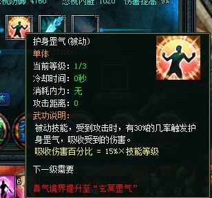 护身罡气:被动技能,受到攻击时,有30%的几率触发护身罡气,吸收受到的伤害。吸收伤害百分比=15%×技能等级。这一技能无疑相当于一个绝佳的防护罩,一旦触发,就能让玩家免于伤害。护身罡气的等级同样与真气境界相对应: