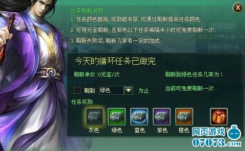使用元宝可以刷新任务品质,每天一开始可以免费刷新一次循环任务,且每隔半小时可以免费刷新一次任务,(如图)当倒计时为0时即可免费刷新。每次刷新任务成功可提升一阶任务品质,既:刷新绿色任务成功变成蓝色,刷新蓝色任务成功变成紫色。任务刷新失败时有一定的机率加成,免费刷新最高只能刷到紫色品质;刷新到橙色任务需要用元宝刷新。若玩家前一天刷新到蓝色任务,第二天保留玩家的任务颜色,玩家可以接下来刷新。使用元宝刷新任务品质,消耗元宝的数量会随着任务的品质而提升,每次刷新失败之后都会提升下一次刷新的成功率。