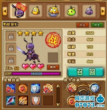 宠物技能是宠物的杀手锏,在战斗中可以发挥巨大的威力。强力的主动技能甚至可以秒人,这些技能都是在宠物的成长过程中自动领悟的。技能等级越高效果逐渐增强,目前一些威力强大的技能已经被大家发现,更多不同种类的宠物有着更多的不同的逆天技能,等待着大家去体验和摸索。