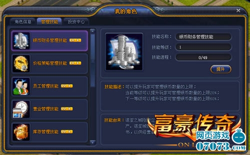 麒润《富豪传奇》游戏里管理技能一共若干个,各个技能分别在不同的方面发挥着重要的作用。