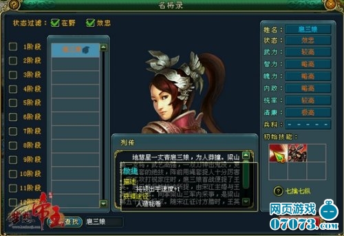 在《梦想帝王》里,扈三娘同样也是一位武艺高强的女将,大家在游戏中很早就能接触到她,拥有较高的武力和统率属性,搭配先手的“神速”技能,让扈三娘成为一阶名将中不可多的好将!