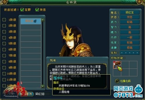 在《梦想帝王》里,梁红玉的智力与魄力尤其突出,而其拥有的冲车擅长技能使其成为攻城拔寨时女将里的第一选择。