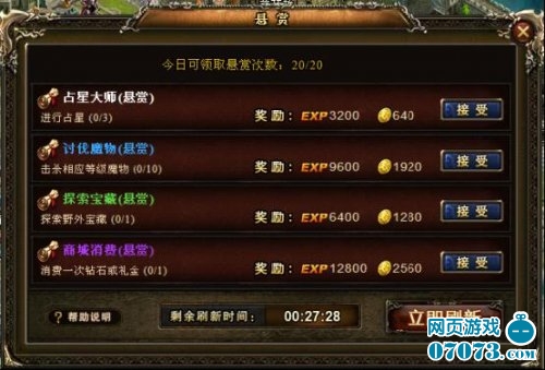 2:悬赏任务。悬赏不宜太早做,我的悬赏是等到了我没有任务做了,经验卡住不能升级的情况下才做,新区前3天只做黄色最高悬赏。花点小钱,潇洒一下。系统17级开放的“悬赏任务”可以说是一个免费送经验的地方,每日将有20次接取悬赏任务的机会,我们可以尽量选择紫色或者橙色的任务去做。