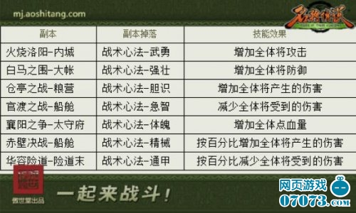 通关特定副本可获得战术心法,点击界面右下角主将按钮,可查看到已有战术心法。目前,《名将传说》共计有武勇、强壮、胆识、急智、体魄、精械和通甲7种战术心法,其分别的掉落副本和效果作用如下表所示: