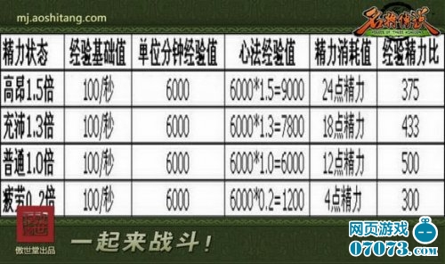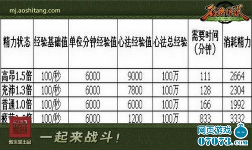 假设我们升级的心法需要总经验100万,那么在各种精力状态下需要多少时间以及消耗多少精力呢?请看下表:
