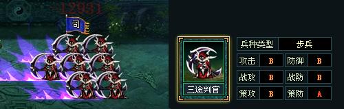 步兵系最不擅长计策,三途判官却是个反例,他有1.65的策攻和0.7的策防,可是会计策的武将大都有文官兵种,而且文官的策略攻防大都比步兵的高,于是三途判官的地位显得极其尴尬——想当输出,攻击不如烈焰和引雷,当坦克,不如文曲重步,虽然普通攻击有几率使敌人士气低落,但是持续1回合略显坑爹,所以说,“鸡肋”是三途判官最大的特色。