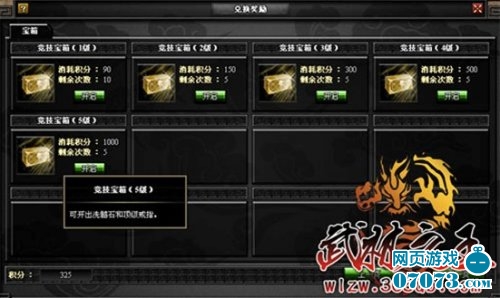 玩家在风云殿中每天将有10次挑战次数,不论输赢都将获得一定的竞技积分。玩家可以点击“兑换奖励”按钮,使用积分来开启竞技宝箱(1~5级)。宝箱中可以开出“洗髓石、高级丹药、资质丹、高级戒指”等奖励。