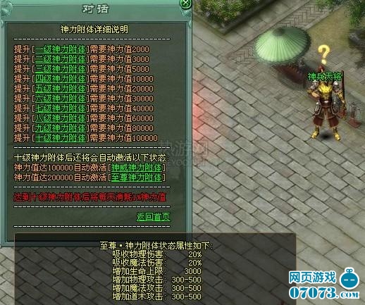 256玩《傲视遮天》一共有十级神力附体呢,由于图片纵多,大家自己去npc”神兵天将”那看吧。玩家除了强化装备可以提升属性之外又多了一条出路,可喜可贺。挑战高级boss不仅能获得顶级装备而且能获得神力值。有兴趣的玩家的可以在7月4日13:00来玩我们256玩《傲视遮天>双线6服“霸者屠龙”,新服已经进入倒计时阶段,欢迎大家来体验傲视遮天的新玩法。