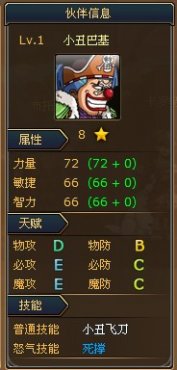 小丑巴基,所需声望2000。吃下了“四分五裂”果实的小丑,虽然狂妄但是实力却不怎么样,虽然不被人当一回事但是运气却出奇的好,一直是十分搞笑的存在。不过据说他的来历非同小可。