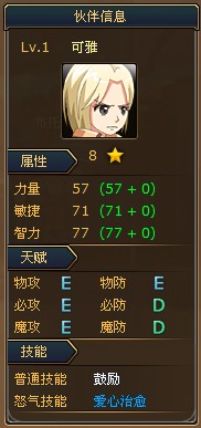 怒气技能爱心治愈[特殊]:可雅的精心呵护,给血量最少的目标回复较多生命。
