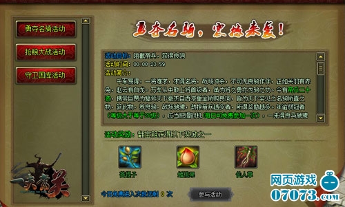 无论是截杀商兵,取回珍贵的仙药,还是抢夺贼匪的粮草,甚至是立誓守卫国库,至死也不会退缩,要玩《一夫当关》的三大活动都将带给你不一样的体验,争霸三国不再只是一味的攻城略地,还要顾及衣食民生,引导道德风向,唯有诸样事务都兼顾得当的君主,才能最终赢得天下!