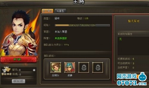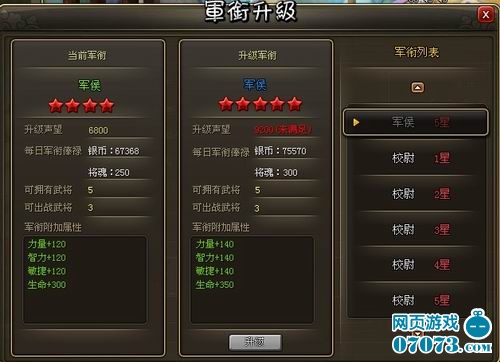 点击人物头像进入军衔界面可以看到人物当前军衔,龙将独有的军衔系统不仅可以为玩家带来大量的属性加成和硬币以及将魂收入,还能增加玩家出战将领数,对玩家部队战斗力的提升起着极为重要的作用。首先龙将的军团系统共分为七大等级,其中每个大等级内附含5个小等级(如军候1星~军候5星),每次提升都有相应的属性加成,当你的军衔达到“中郎将2星”的时候,还可以让你的阵法达到5人出战的最大上限。