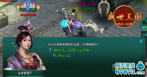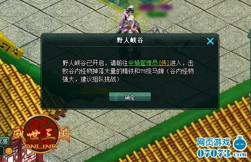通过坐骑管理员,玩家们可以进入野人峡谷,只要击败了谷内怪物,则会掉落大量的精铁和75级马牌,由于峡谷内的怪物十分的强大,因此是建议玩家们组队挑战。当你来到坐骑管理员NPC处,切勿别忘了接取神驹任务,初探野人谷,一切从这里开始!