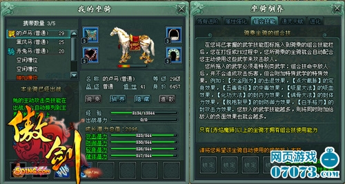 拥有组合技能以后,无论你是在与BOSS对战,还是在和玩家进行PK,只要你与你的爱骑一同作战,就有一定几率触发组合技能,组合技能在命中敌人时虽不会造成攻击伤害,但是它所带来的特殊效果也让敌人防不胜防,例如大金刚力有可能直接达到击退敌人的效果,还有点穴截脉可使敌人定身,五毒奇经可使敌人中毒等等。坐骑学到的组合技能越多,各种负面效果也就越多!