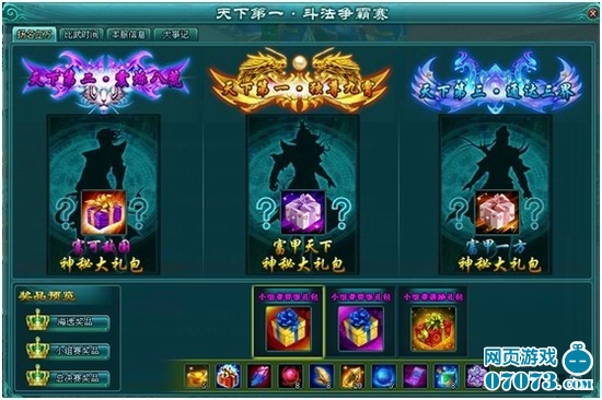 除了服务器内的竞技大赛之外,还会有不定期的天下第一斗法大会跨服竞技活动!参加跨服激斗不仅能获得竞技场的基本奖励,还有让人兴奋的超级大礼包以及帅气拉风的特殊称号等你收入囊中!还等什么?快为即将到来的火爆斗法提升战力吧!