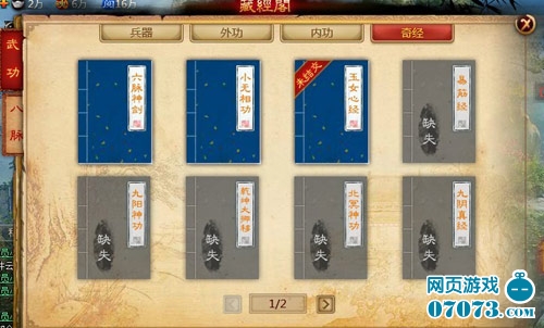 想要成为一代宗师,总要掌握些个绝世武功的说。在05wan《一代宗师》中,各种绝世武功的获得,主要是通过“藏经阁”里面获得的。当玩家等级达到6级之后,藏经阁即可开放,各种“兵器”“内功”“外功”“奇经”也会对玩家一一开放,从此玩家再也不用发愁没有武功可学习了。