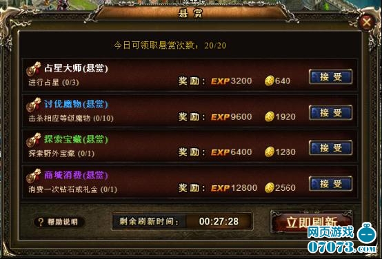 ¡¡¡¡2£ºÐüÉÍÈÎÎñ¡£ÐüÉͲ»ÒËÌ«Ôç×ö£¬ÎÒµÄÐüÉÍÊǵȵ½ÁËÎÒûÓÐÈÎÎñ×öÁË£¬¾Ñ鿨ס²»ÄÜÉý¼¶µÄÇé¿öϲÅ×ö£¬ÐÂÇøÇ°3ÌìÖ»×ö»ÆÉ«×î¸ßÐüÉÍ¡£»¨µãСǮ£¬äìÈ÷һϡ£ÏµÍ³17¼¶¿ª·ÅµÄ“ÐüÉÍÈÎÎñ”¿ÉÒÔ˵ÊÇÒ»¸öÃâ·ÑË;ÑéµÄµØ·½£¬Ã¿ÈÕ½«ÓÐ20´Î½ÓÈ¡ÐüÉÍÈÎÎñµÄ»ú»á£¬ÎÒÃÇ¿ÉÒÔ¾¡Á¿Ñ¡Ôñ×ÏÉ«»òÕß³ÈÉ«µÄÈÎÎñÈ¥×ö¡£