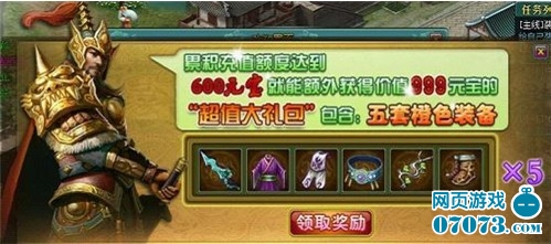 ¡¡¡¡Íæ¼ÒÀÛ»ý³äÖµ´ïµ½600Ôª±¦£¬½ÓÈ¡“½«Ñ¥×ÓÇ¿»¯µ½30¼¶”ÈÎÎñ(Íê³É“×°±¸Ñ¥×Ó”ÈÎÎñ)£¬²¢ÁìÈ¡Ê׳äÀñ°üºó¼´¿É»ñµÃ°üº¬5Ì×20¼¶³È×°µÄ»Æ½ðÀñ°ü¡£