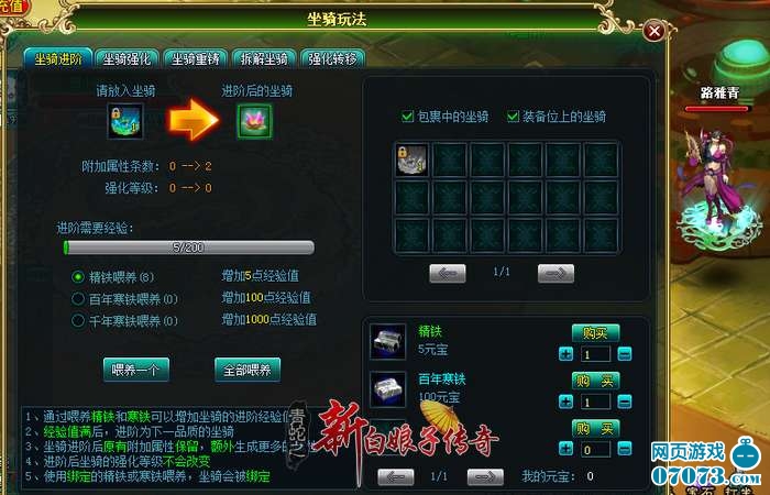 ¡¡¡¡ÒªÉý¼¶×øÆï£¬×ܹ²¿ÉÒÔʹÓþ«Ìú¡¢°ÙÄ꺮Ìú¡¢Ç§Ä꺮Ìú£¬ÕâÈýÖÖ¹±Æ·À´Î¹Ñø¡£¾ÑéÖµÂúºó£¬½ø½×ΪÏÂһƷÖʵÄ×øÆï£¬ÔÓеĸ½¼ÓÊôÐÔ±£Áô£¬¶îÍâÉú³É¸ü¶àµÄÊôÐÔ¡£°ÙÄ꺮ÌúºÍǧÄ꺮ÌúµÄµôÂ伸Âʽϵͣ¬Ð¡±à»¹Êǽ¨ÒéÍæ¼ÒÿÌìÒÔ¾«ÌúÎ¹Ñø¡£¾«Ìú¿ÉÒÔͨ¹ýÿÈյǽ½±Àø£¬»îÔ¾¸£Àû£¬¸±±¾ÈÎÎñ£¬»Æ½ð¸£´ü£¬³äÖµÀñ°üµÈ¶àÖÖ;¾¶À´»ñÈ¡¡£ÒªÏàÐÅÌú°ôÖÕ¿ÉÒÔÄ¥³ÉÕë!