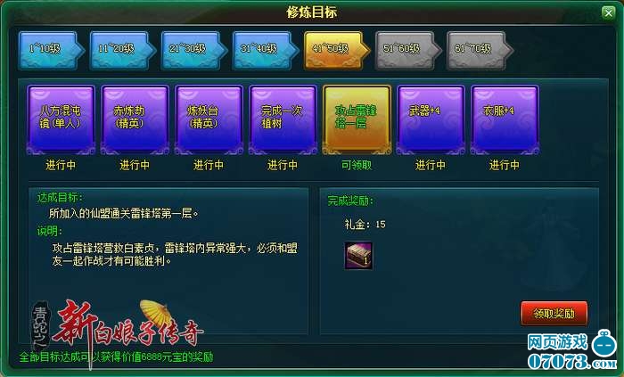 ¡¡¡¡“ÐÞÁ¶Ä¿±ê”¸ù¾ÝÍæ¼Ò½ÇÉ«µÄµ±Ç°µÈ¼¶Ç°½ø£¬¹²·ÖΪ7¸ö½×¶Î£¬Ã¿10¼¶Ò»¸ö½×¶Î£¬Ã¿¸ö½×¶Î¶¼Óв»Í¬ÊýÁ¿µÄÈÎÎñ¡£´ÓµÚ¶þ½×¶Î(11~20¼¶)Æð£¬Ã¿´ï³ÉÒ»¸öÄ¿±ê¶¼ÓÐÉÙÁ¿Àñ½ðÁìÈ¡£¬»¹¸½´ø¸÷ÖÖ±¦Îï¡£Èç¹û´ï³ÉÈ«²¿Ä¿±ê£¬¼ÛÖµ6888Ôª±¦µÄ½±ÀøµÈ×ÅÄúŶ!
