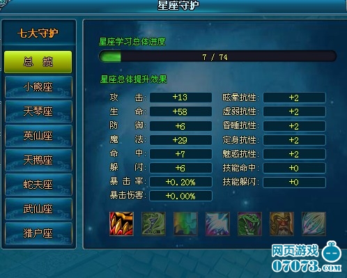 ¡¡¡¡µã»÷¡¾½ÇÉ«¡¿°´Å¥£¬Ñ¡Ôñ¡¾ÊØ»¤¡¿°æ¿é¿ÉÒÔÖ±½Ó½øÈëÐÇ×ùÊØ»¤×ÜÀÀ½çÃæ¡£Ö÷½çÃæ×ó±ßÊǸ÷¸öÐÇ×ù°´Å¥£¬ÓÒ±ßÔòÏÔʾµ±Ç°Íæ¼ÒÒ»¹²ÒÑѧϰÁ˶àÉÙ¸öÐÇ×ù·ÖÖ§µã£¬ÕâЩ·ÖÖ§µã¶ÔÓ¦Íæ¼Ò¸÷ÖÖÊôÐÔÌáÉýµÄ×ÜÖµ£¬»¹ÓÐÒÑѧµ½µÄÐÇ×ùÊØ»¤¼¼ÄÜ¡£