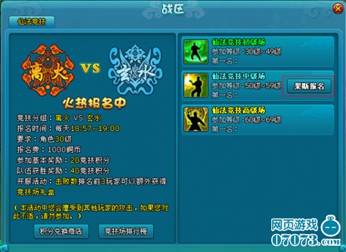 ¡¡¡¡µ±ÄãÔÚ¾ºÓÎÍø¡¶Ãλ÷ÉÏÉ¡·ÖÐÀúÁ·£¬µÈ¼¶´ïµ½30¼¶ÒÔÉÏ£¬ÏÉ·¨¾º¼¼³¡µÄ´óÞÍΪÄ㿪Æô£¬“Àë»ð”¡¢“ÐþË®”Á½×é¶ÔÕ½£¬ÃüÔ˽«°ÑÄãºÍÄãµÄ¶ÔÊÖËæ»úµÄ°²ÅÅÔÚÒ»Æð£¬ÕâÒ»ÇУ¬¶¼ÊÇÃüÔ˵ݲÅÅ¡£ËùÓвÎÈüÍæ¼ÒÔÚ±ÈÈü½áÊøºó°´Õճɼ¨¿ÉÒÔ»ñµÃ¾º¼¼³¡»ý·Ö£¬ÕâЩ»ý·Ö¾ÍÊǶһ»¼«Æ·ÕäÏ¡µÀ¾ßµÄÖØÒªÍ¨µÀ¡£