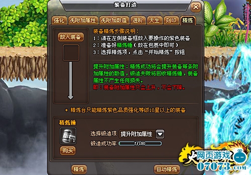 ¡¡¡¡µ±×°±¸ÒѾǿ»¯µ½¼«Ö£¬È´»¹Ïë¸ü½øÒ»²½£¬Õâ¸ÃÔõô°ì?´ð°¸µ±È»ÊǽøÐо«Á¶!Ö»Õë¶Ô×ÏɫƷÖÊÇ¿»¯µÈ¼¶10ÐÇÒÔÉϵÄ×°±¸£¬Í¨¹ýµÀ¾ß¾«Á¶´¸£¬¾«Á¶³É¹¦ÒÔºó×°±¸½«»áÌáÉýÔÓÐÿÌõ¸½¼ÓÊôÐÔµÄÊýÖµ!¼´Ê¹¾«Á¶Ê§°Ü£¬×°±¸ÊôÐÔÒ²²»»á²úÉúÈκÎËðʧ¡£