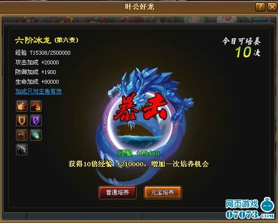 ¡¡¡¡ÒªÖªµÀÔÚÓÎÏ·ÖУ¬Ã¿Ò»ÌõÊôÐÔ¶¼ÖÁ¹ØÖØÒª£¬¶ÔÓÚÕ½¶·À´Ëµ¶¼Æðµ½Á˾ö¶¨ÐÔµÄ×÷Óã¬ËùÒÔÁúµÄºÃ»µÓ°Ïìµ½ÁËÍæ¼ÒµÄʵÁ¦¡£Íæ¼ÒÿÌì¿ÉÒÔ¶Ô×Ô¼ºµÄÁú½øÐÐÅàÑø£¬Ã¿ÌìÓÐ20´ÎµÄ»ú»á¡£Èç¹û³öÏÖ±©»÷£¬¿ÉÒÔÔö¼ÓÒ»´Î»ú»á¡£Ã¿ÌìǰÈý´ÎÔª±¦ÅàÑø£¬°Ù·ÖÖ®°Ù³öÏÖ±©»÷¡£Í¬Ê±Ò²¿ÉÒÔʹÓÃÍÇ®ÅàÑø¡£