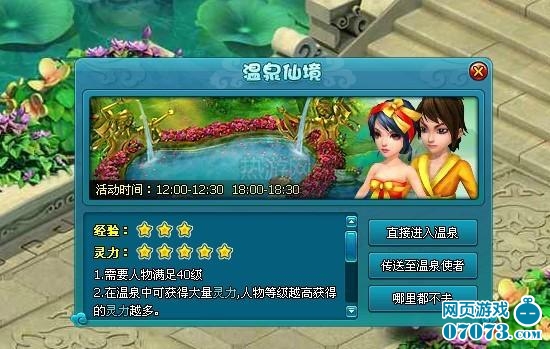 ¡¡¡¡¸÷λ·ÉÏÉÓÂÊ¿£¬ÔÚΨÃÀÀËÂþµÄy3399¡¶Ãλ÷ÉÏÉ¡·ÓÎÏ·ÊÀ½ç²ÎÓëÀúÁ·Ö®Ê±£¬µÈ¼¶´ïµ½40¼¶Ö®ºó£¬¾ÍÄܲÎÓë·ÉÏÉÊÀ½çÌØÉ«µÄÏɾ³ÎÂȪŶ¡£Ã¿Ìì¶¼ÓÐÿÌìÓÐÁ½¸öʱ¶Î¿ÉÒÔ½øÈëÎÂȪÏɾ³½±Àø£¬·Ö±ðÊÇÖÐÎç12:00-12:30 ºÍÏÂÎç18:00-18:30¡£»î¶¯¿ªÆôºóÍæ¼ÒÃæ°å×Ô¶¯³öÏÖÌáʾͼ±ê£¬Âú×ãÌõ¼þµÄ¸÷λÓÂÊ¿¿ÉÔڹ涨ʱ¼äÄÚ×ÔÓɳöÈëÎÂȪÏɾ³£¬ÌåÑéìÅ¿áÏÄÈÕ×îÐÂÆæµÄã«ÒâÎÂȪ¡£