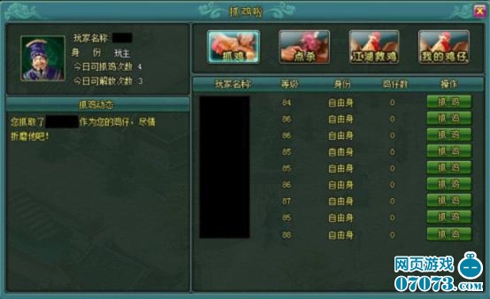 ¡¡¡¡Íæ¼Ò¿ÉÔÚ×¥¼¦ÁбíÖÐÌôÕ½ÁíÒ»ÃûÍæ¼Ò£¬Ê¤Àûºó¿ÉʹÕâÃûÍæ¼Ò³ÉΪ×Ô¼ºµÄ“¼¦×Д£¬¶ø×Ô¼ºÉí·Ý±äΪ“ÍæÖ÷”¡£“ÍæÖ÷”µÄÊÕÒæÊǰ´ÕÕ“¼¦×ДµÄµÈ¼¶ºÍ“¼¦×Д×ö¿àÁ¦µÄʱ¼äÀ´¾ö¶¨µÄ¡£µ±Íæ¼Ò³É¹¦×¥»ñ¼¦×ÐÖ®ºó£¬Ò»¶¨Òª¼ÇµÃ¸ôÒ»¶Îʱ¼ä¾ÍÊÕ»ñÒ»´Î¹¦Ñ«£¬·ÀÖ¹¼¦×б»ËûÈË´î¾È»ò×Ô¼º±»×¥µ¼Ö¹¦Ñ«Ëðʧ¡£