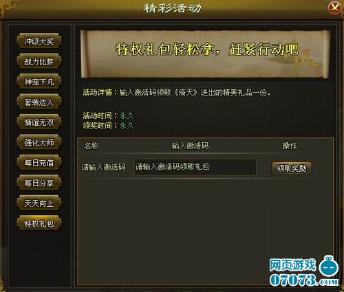 ¡¡¡¡ÁìÈ¡µ½¼¤»îÂëÖ®ºó£¬½øÈëÓÎÏ·£¬µã»÷ÓÒÉϽǵİ´Å¥¾«²Ê»î¶¯½øÈë¡¾ÌØÈ¨Àñ°ü¡¿£¬ÊäÈëÀñÆ·Âë¼´¿ÉµÃµ½“ÒÐÌìÍÀÁúÀñ°ü”£¬Àñ°üÄÚÈݰüÀ¨µÍ¼¶¿ª¿×ʯ×5¡¢µÍ¼¶Ç¿»¯Ê¯×5¡¢µÍ¼¶Ï´Á·Ê¯×10¡¢2¼¶¹¥»÷ʯ×1¡¢2¼¶·ÀÓùʯ×1£¬ÐèҪעÒâµÄÊÇÿ¸öÇøÃ¿¸ö½ÇÉ«½ö¿ÉʹÓÃÒ»´ÎͬÅúµÄÀñÆ·Âë¡£