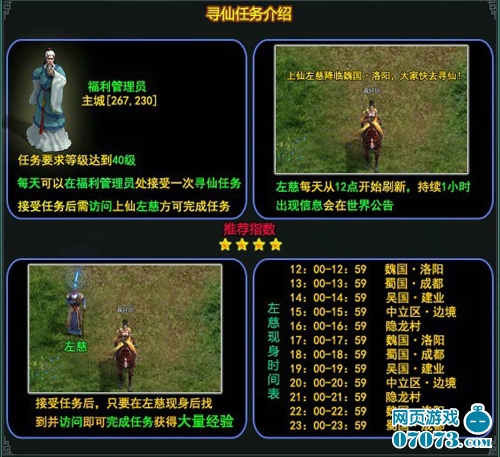 ¡¡¡¡3737¡¶Ê¢ÊÀÈý¹ú¡·µÈ¼¶´óÓÚ40¼¶µÄÍæ¼ÒÿÌì¿ÉÒÔÔÚ¸£Àû¹ÜÀíÔ±´¦Áìȡһ´ÎѰÏÉÈÎÎñ¡£½ÓÈ¡ÈÎÎñºó£¬Ñ°ÕÒÈÎÎñNPC×ó´È¼´¿ÉÍê³ÉÈÎÎñ»ñµÃº£Á¿¾Ñé½±Àø¡£×ó´ÈÿÌì´ÓÖÐÎç12µã¿ªÊ¼Ë¢Ð£¬³ÖÐøÒ»Ð¡Ê±³öÏÖÐÅÏ¢»áÔÚÊÀ½ç¹«¸æ£¬¿´µ½¹«¸æ¾ÍËٶȸÏÍùÄ¿µÄµØ°É£¬ÏÉÈË¿ÉÊÇÒ»µã¶¼±ÈÁߨÄŶ!