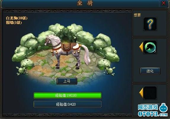 ¡¡¡¡µ±×øÆïÌáÉýµ½Ê®¼¶±ã¿É½ø»¯£¬ÕâʱÐèÒªÐÞÉÉ×øÆïΧǽ£¬Ö»Òªµ½¶¨¾üɽÖвɿó½øÐÐΧǽÐÞÝݾͿÉÀ²!×øÆï½ø»¯ºó²»½öÍâ±í»á¸ü¼Ó°ÔÆøÀ·ç£¬¸øÖ÷½ÇµÄÊôÐÔ¼Ó³ÉÒ²»á¸ü¸ß!½ø»¯×øÆïÒÔºó¾Í¿ÉÒÔ¿çÉϸü°ÔÆøÇ¿´óµÄ×øÆïÕ÷Õ½ÌìÏÂÁË!