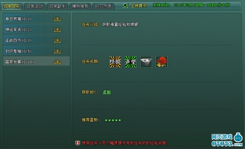 ¡¡¡¡´Ó¼Ò×å½çÃæ»Ø³Çºó£¬Íæ¼Ò¿ÉÒÔÏȰÑËùÓÐÄܽӵÄÈÎÎñ½ÓÁË£¬°üÀ¨¼Ò×åÈÎÎñ¡¢¹ú¼Ò·¢Õ¹ÈÎÎñ¡¢Õ÷Õ½ËÄ·½ÈÎÎñ¡¢ÁÔÈËÈÎÎñºÍѰÏÉÈÎÎñ¡£µ±È»ÄÜʹÓÃÈÎÎñÁîµÄ×îºÃʹÓÃÈÎÎñÁÄÜÓøßÒ»¼¶µÄ¾ÍÓøßÒ»¼¶µÄ¡£ÒòΪ6711¡¶Ê¢ÊÀÈý¹ú¡·µÄ¾ÑéÀ´Ô´Ö÷Òª¾ÍÊÇÈÕ³£ÈÎÎñ£¬µ«ÊǽÓÈÎÎñµÄʱºòµÃ×¢ÒâÊÇ·ñÓлÈÎÎñ£¬Èç¹ûÄãÔڻÆÚ¼äʵÔÚ²»ÄÜÔÚÏߵĻ°Ò²¿ÉÒÔÒ»Æð½ÓÁË£¬ÒòΪ»î¶¯ÈÎÎñµÄ¾ÑéÕæµÄÈÃÈËÊ®·ÖÐ͝¡£